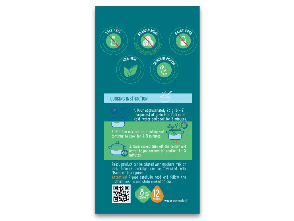 Ze sáčku odsypeme 6 až 7 čajových lžiček výrobku do hrnce s 250 ml studené vody a necháme 5 minut odstát. Směs poté mícháme až je přivedena k varu a pokračujeme v míchání po dobu vaření 4 až 5 minut. Poté sporák vypneme a kaši necháme dojít pod pokličkou po dobu dalších 4 až 5 minut. Hotovou kaši můžete dochutit Mamuko ovocným pyré nebo tak, jak to máte rádi :-)