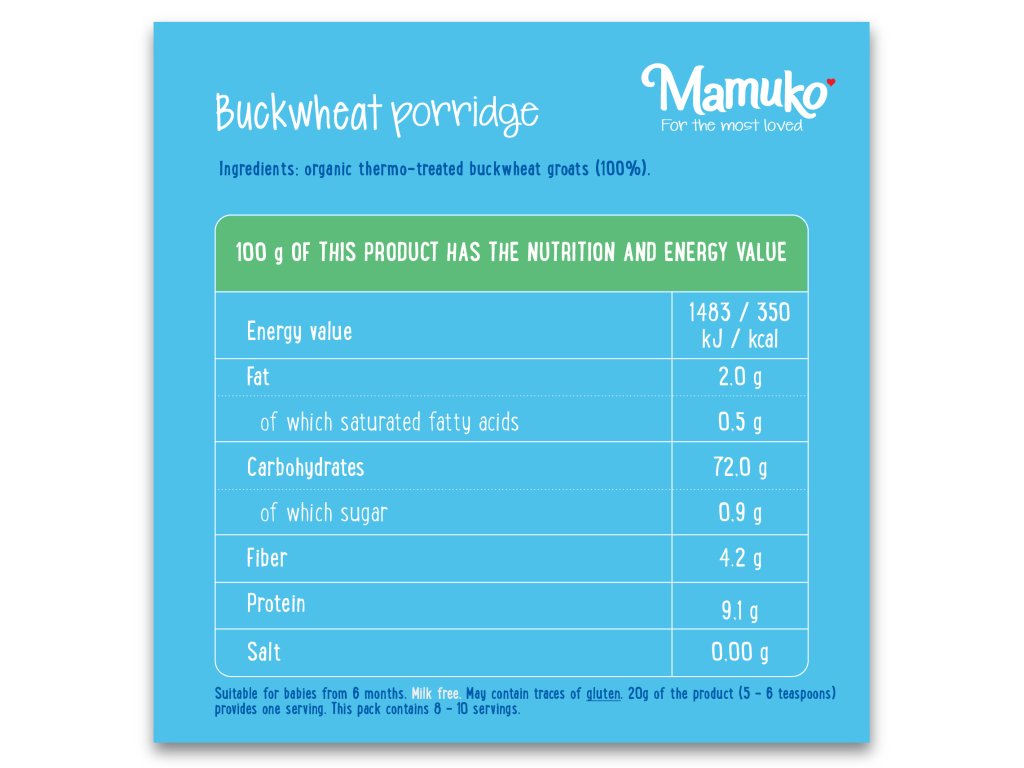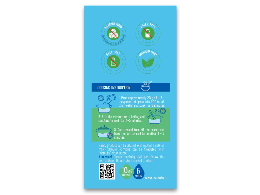 Ze sáčku odsypeme 5 až 6 čajových lžiček výrobku do hrnce s 200 ml studené vody a necháme 5 minut odstát. Směs poté mícháme až je přivedena k varu a pokračujeme v míchání po dobu vaření 4 až 5 minut. Poté sporák vypneme a kaši necháme dojít pod pokličkou po dobu dalších 4 až 5 minut. Hotovou kaši lze ředit mateřským mlékem nebo mléčnou výživou. Můžete také dochutit Mamuko ovocným pyré nebo tak, jak to máte rádi :-)