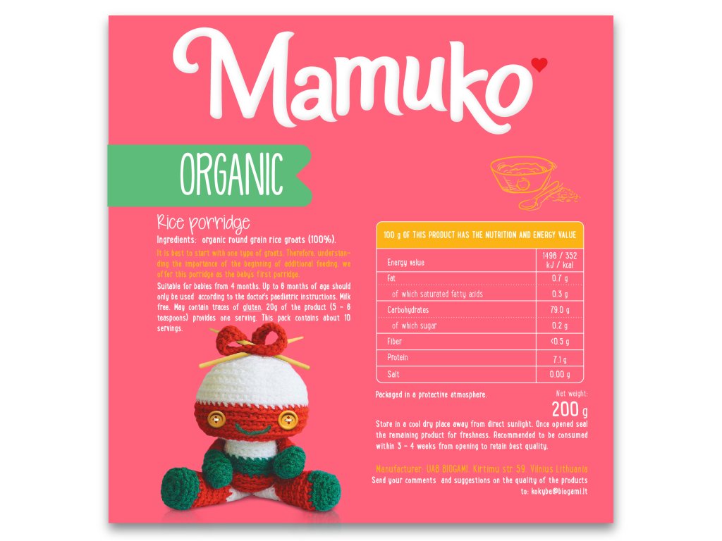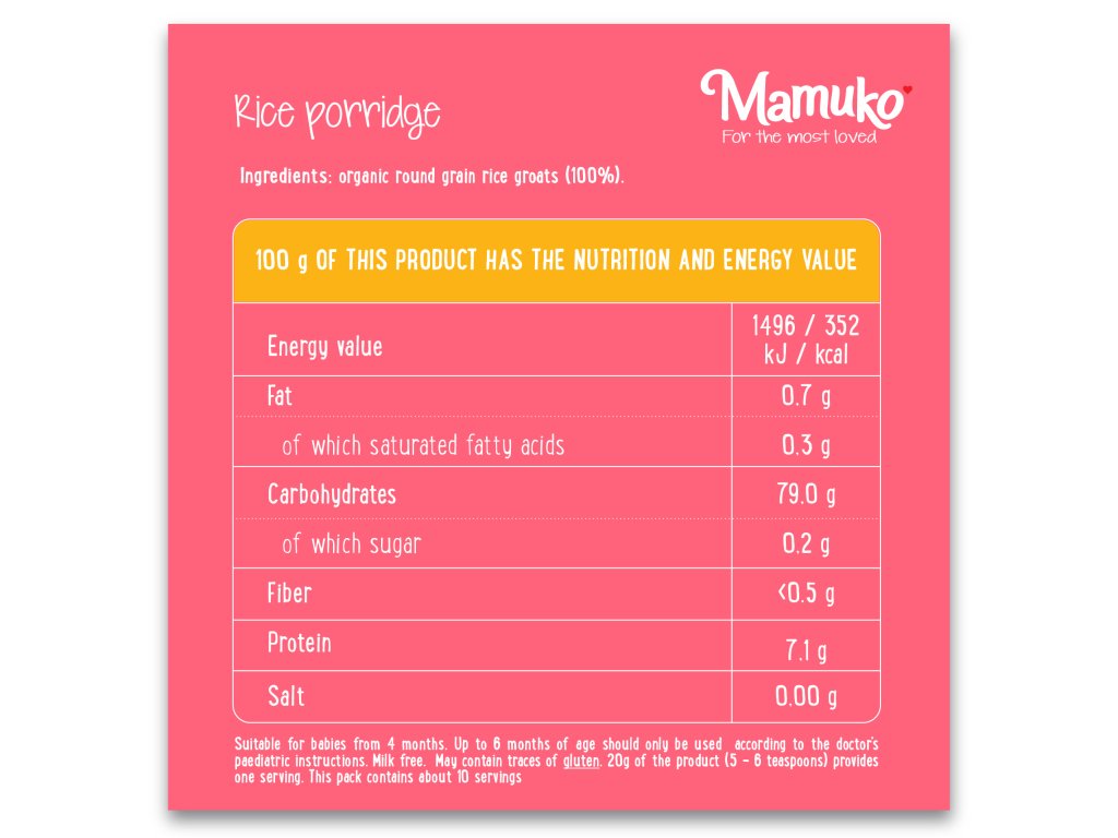 Ze sáčku odsypeme 4 až 5 čajových lžiček výrobku do hrnce s 200 ml studené vody a necháme 5 minut odstát. Směs poté mícháme až je přivedena k varu a pokračujeme v míchání po dobu vaření 4 až 5 minut. Poté sporák vypneme a kaši necháme dojít pod pokličkou po dobu dalších 4 až 5 minut. Hotovou kaši lze ředit mateřským mlékem nebo mléčnou výživou. Můžete také dochutit Mamuko ovocným pyré nebo tak, jak to máte rádi :-)