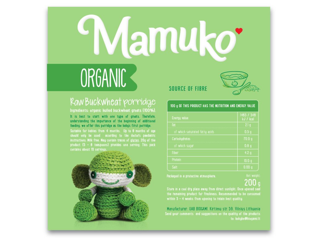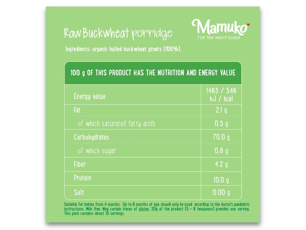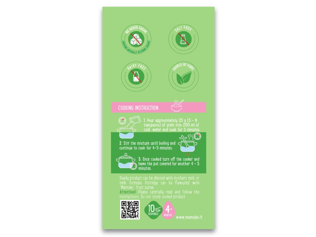 Ze sáčku odsypeme 4 až 5 čajových lžiček výrobku do hrnce s 200 ml studené vody a necháme 5 minut odstát. Směs poté mícháme až je přivedena k varu a pokračujeme v míchání po dobu vaření 4 až 5 minut. Poté sporák vypneme a kaši necháme dojít pod pokličkou po dobu dalších 4 až 5 minut. Hotovou kaši lze ředit mateřským mlékem nebo mléčnou výživou. Můžete také dochutit Mamuko ovocným pyré nebo tak, jak to máte rádi :-)