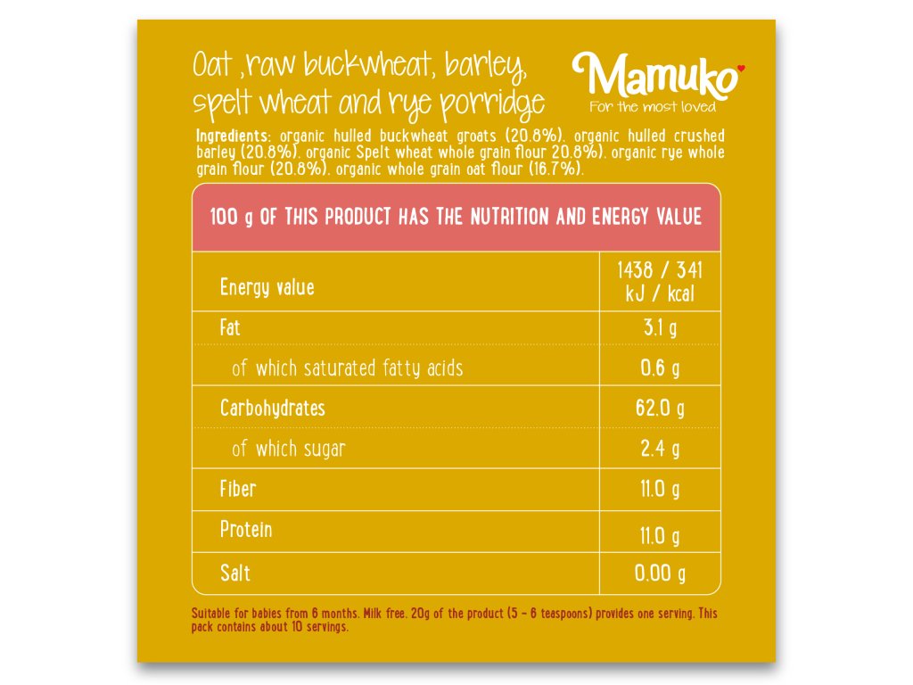 organická krupice z loupané zelené pohanky (20,8%), organický drcený loupaný ječmen (20,8%), organická celozrnná špaldová mouka (20,8%), organická celozrnná žitná mouka (20,8%), organická celozrnná ovesná mouka (16,7%)