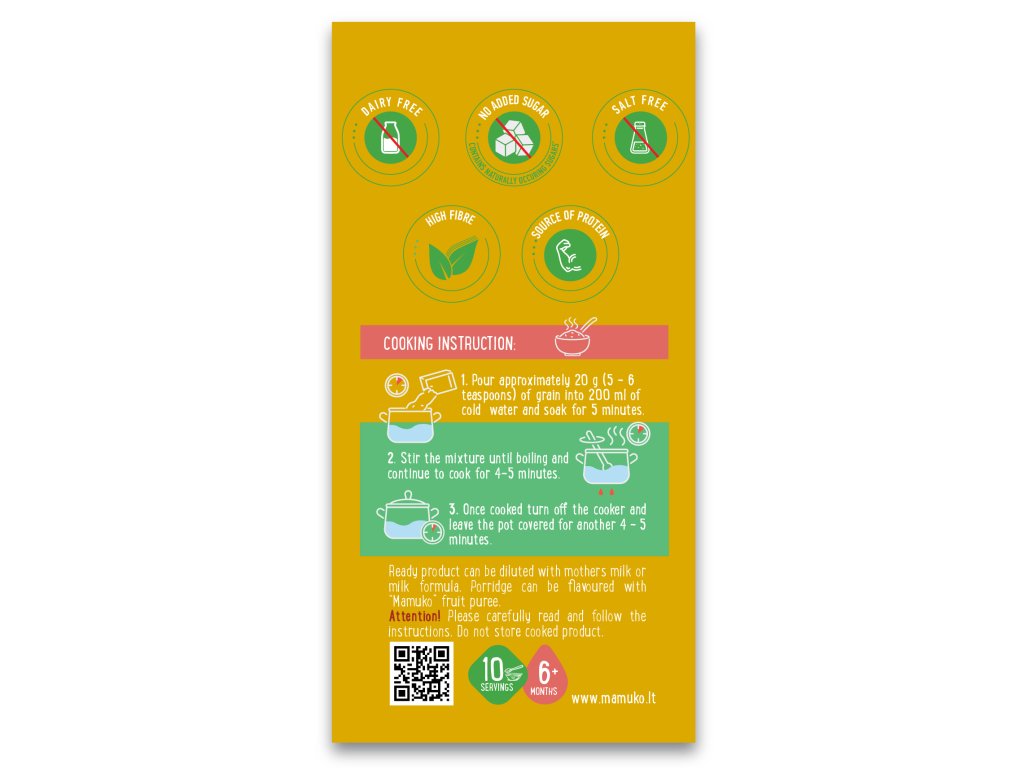 Ze sáčku odsypeme 4 až 5 čajových lžiček výrobku do hrnce s 200 ml studené vody a necháme 5 minut odstát. Směs poté mícháme až je přivedena k varu a pokračujeme v míchání po dobu vaření 4 až 5 minut. Poté sporák vypneme a kaši necháme dojít pod pokličkou po dobu dalších 4 až 5 minut. Hotovou kaši lze ředit mateřským mlékem nebo mléčnou výživou. Můžete také dochutit Mamuko ovocným pyré nebo tak, jak to máte rádi :-)