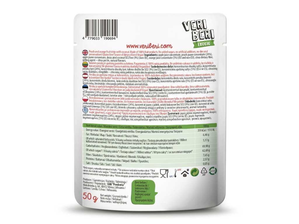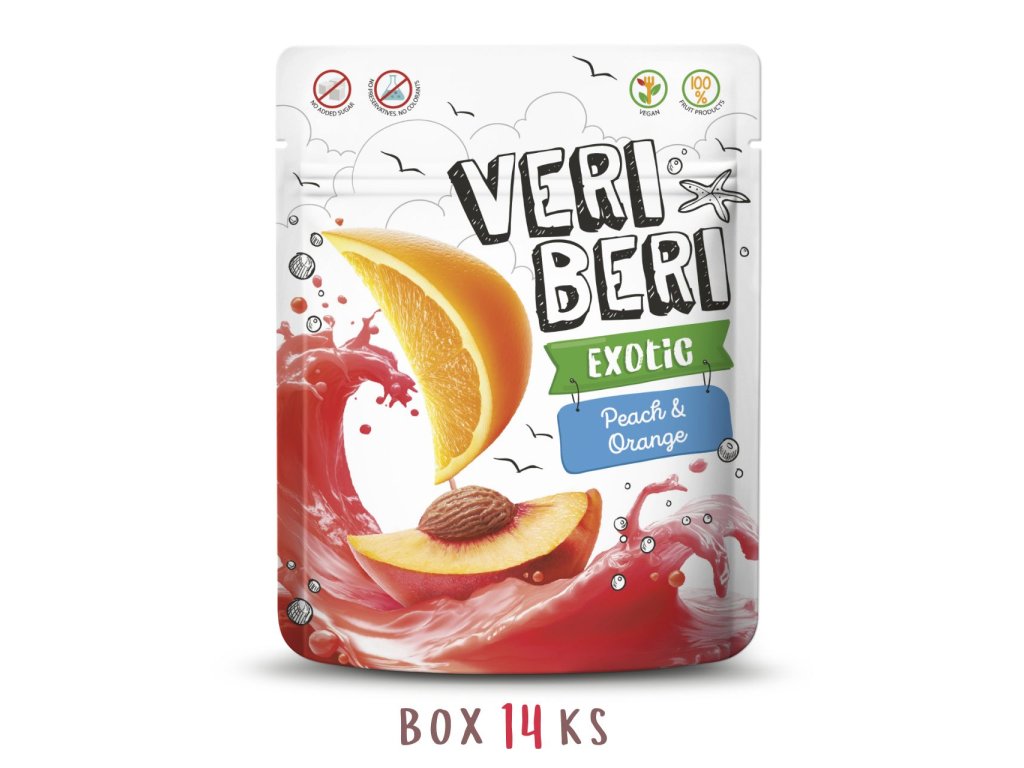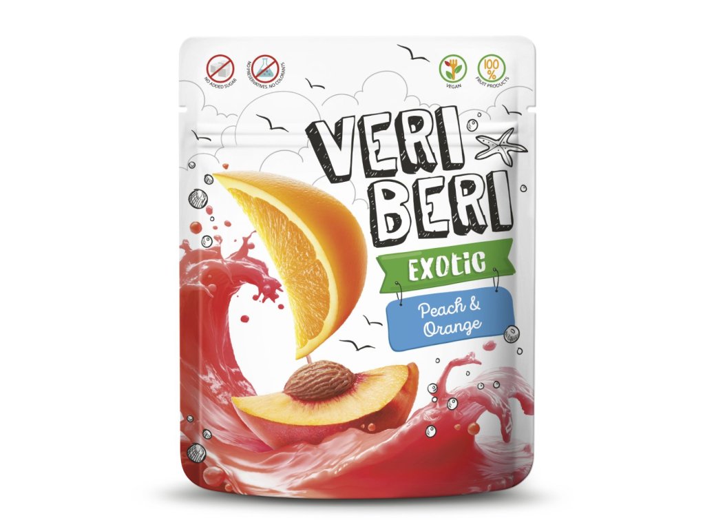 Veri Beri Exotic Broskev a Pomeranč je přírodní sladkost vyrobená výhradně ze složek pocházejících z ovoce a je 100% přírodním produktem. Má bohatou chuť čerstvého broskve a pomeranče. Chuť i textura jsou vylepšeny přidáním sušených kokosových kousků.